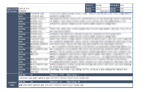 ∙ 업무 프로세스 설명, 리스크 정보, 통제활동, 경영자 주장, 위험통제 테스트 절차 등을 기술한 문서